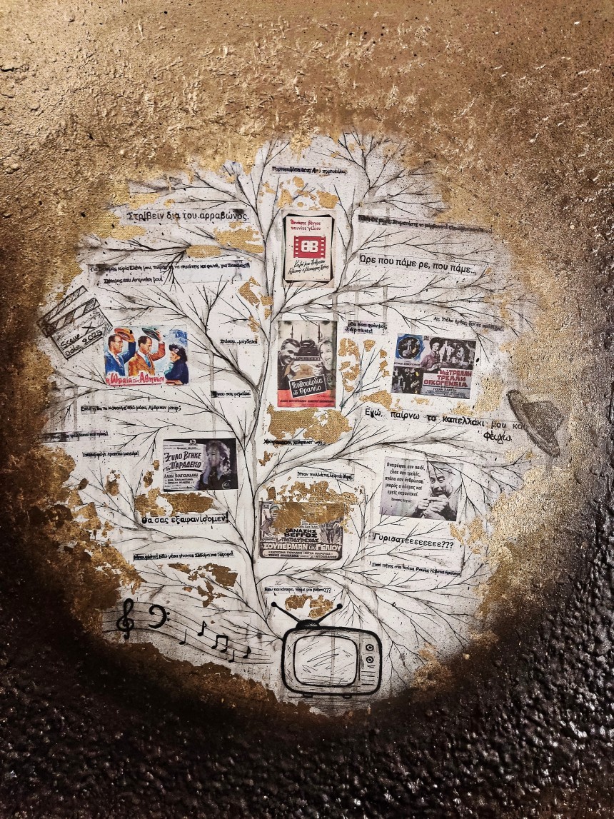 "Αθάνατος Ελληνικός Κινηματογράφος", mixed media (μελάνι, σπρέι, φύλλα χρυσού, λιωμένο κερί🕯️, κολάζ, βερνίκι) σε καμβά 80* 80 cm, 2025...